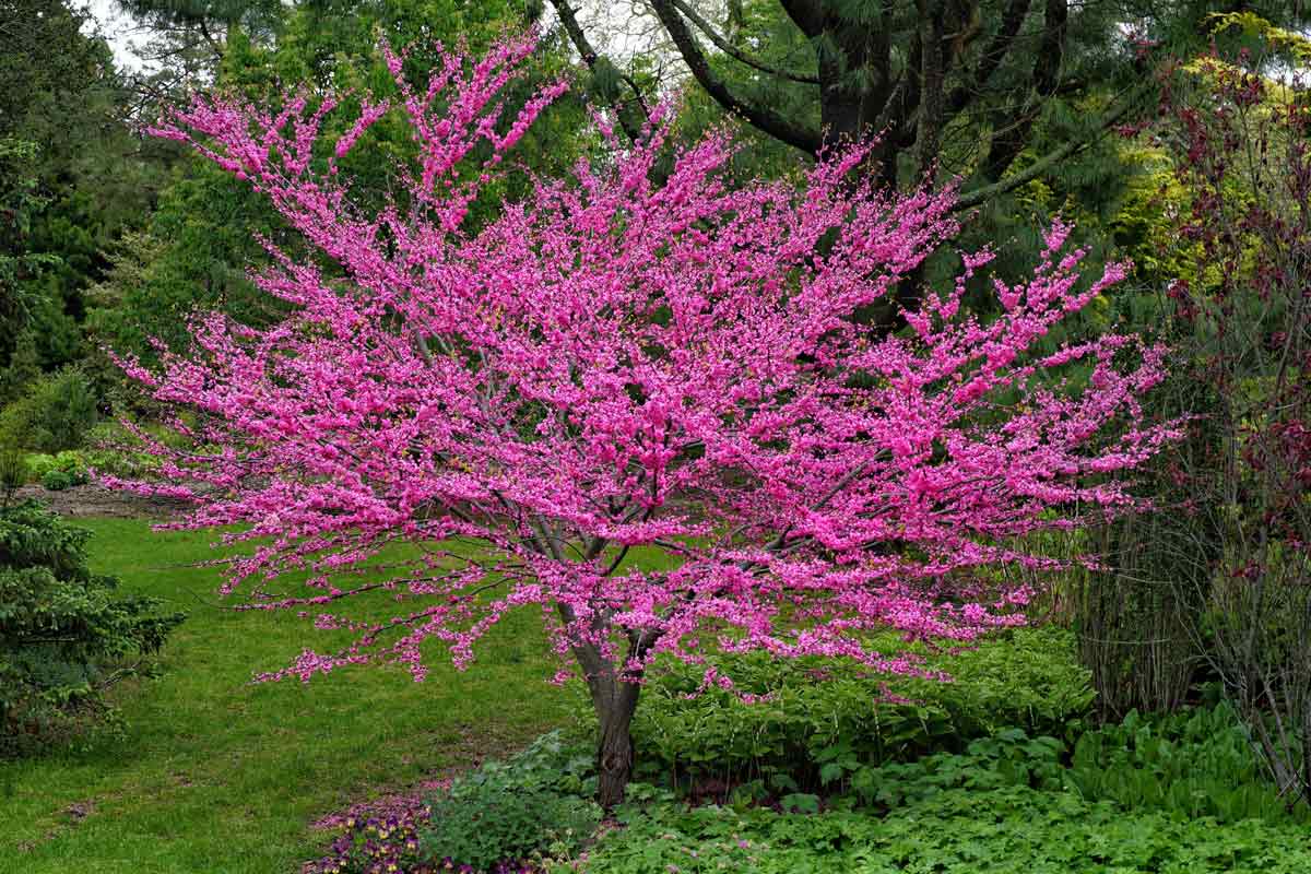 One of the season’s earliest bloomers of the season, redbuds are beloved for their magenta to pinkish-lavender flowers that emerge even before the leaves emerge. The leaves are heart-shaped and turn yellow in fall. Some varieties have dark or golden summer leaves as well.