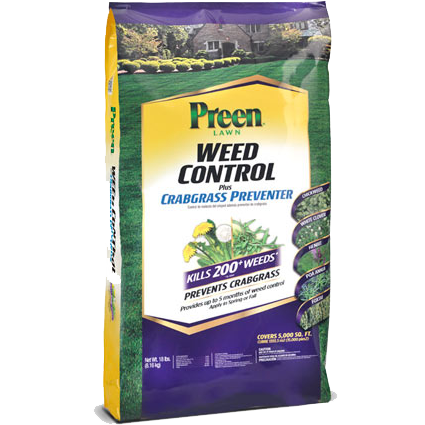 Preen Lawn Weed Control Plus Crabgrass Preventer provides up to 5 months of weed control. This product kills over 200 broadleaf weeds like dandelions, clover, ground ivy, thistle, and chickweed, and prevents crabgrass and other undesirable annual grassy weeds.